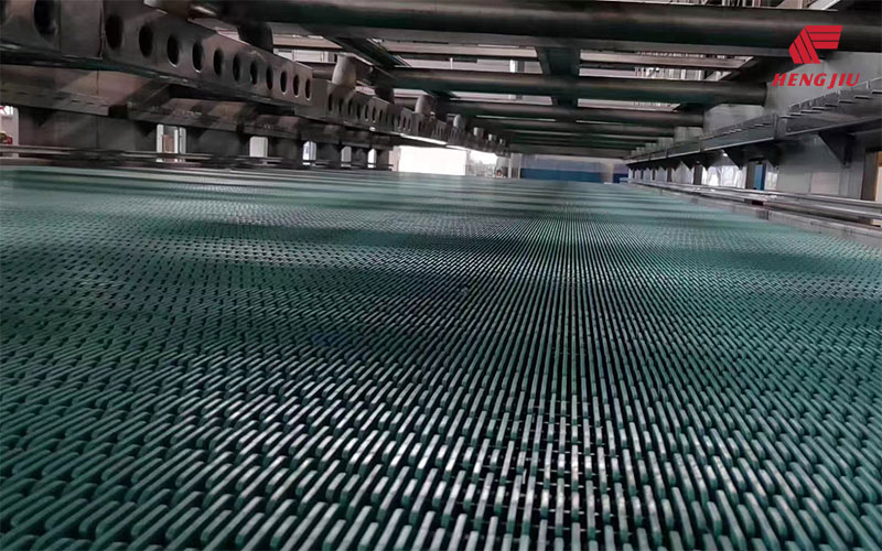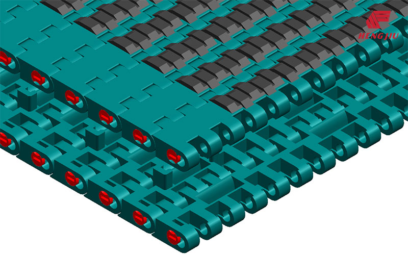 帶橡膠墊/頂部帶橡膠條帶有橡膠墊的爬坡/下坡鏈網能夠光滑順暢的運輸包裝物,這些橡膠墊通過注塑成型被粘結在特制模塊上。根據包裝方式和材料,橡膠墊模塊化鏈網可以在角度最大至20度的場合使用。