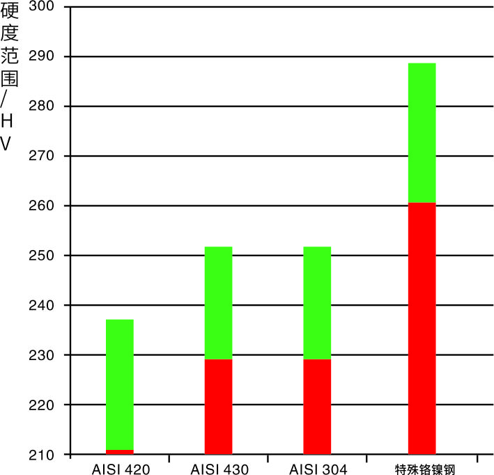 不同材料鏈板的表面硬度范圍(綠色區)如下圖表。